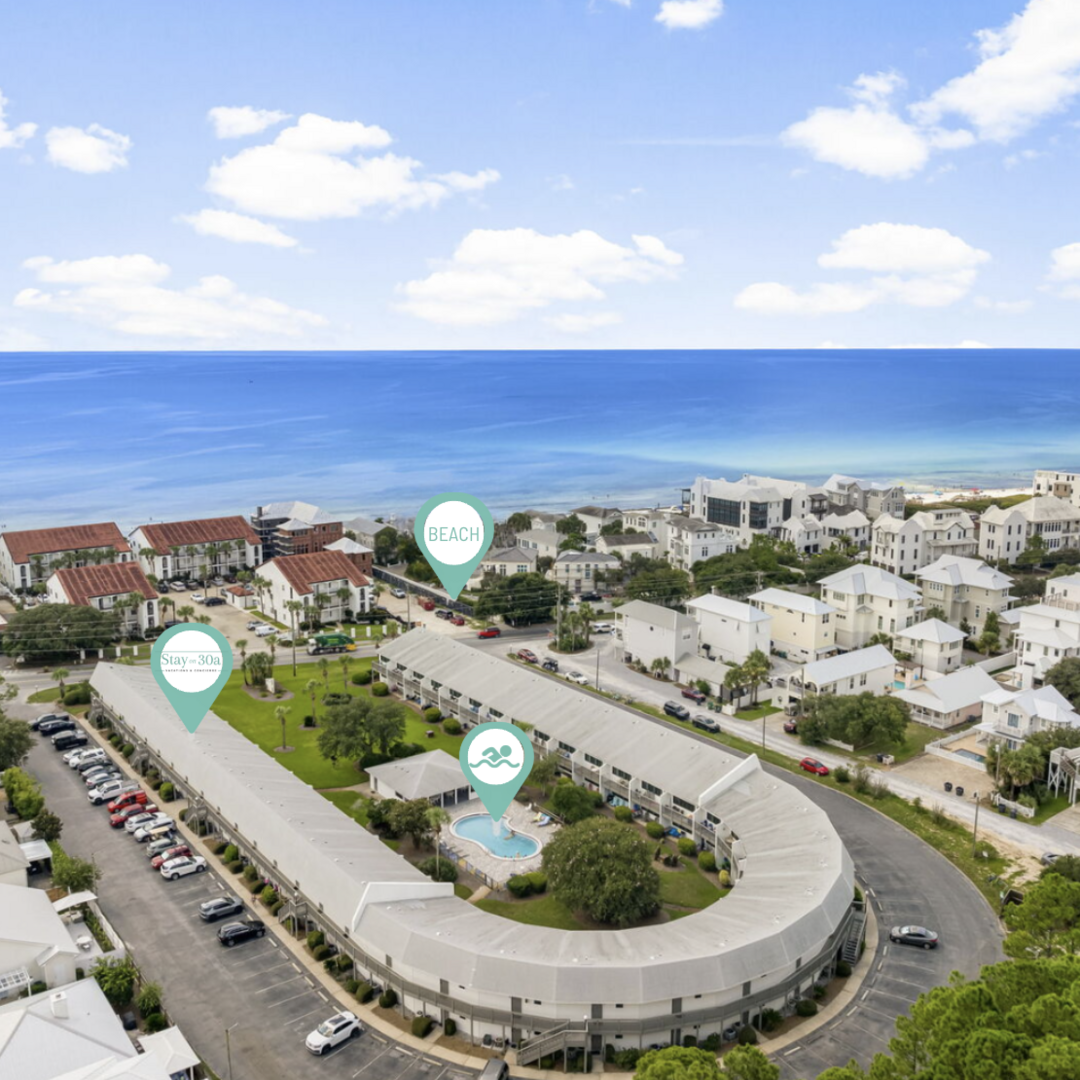 Start your mornings with coffee on your private balcony overlooking the courtyard and sparkling community pool, then grab your beach bag, it’s only 100 feet to the Gulf with dedicated beach access directly across the street. After a sun-soaked day, cool off with a swim, or hop on one of the 2 adult bikes included with your stay to explore the 30A bike path, Seaside, and nearby coastal towns. Whether you’re here for a romantic getaway, a solo escape, or a little beach reset, this retreat puts you in the heart of it all. With Seaside Town Center just a short ride away, you’ll have boutique shops, great restaurants, and that signature laid-back 30A charm right at your fingertips.