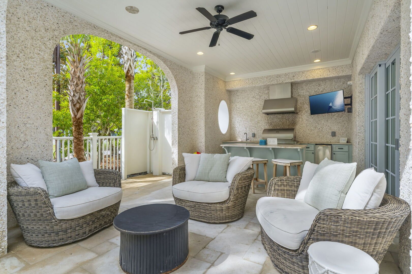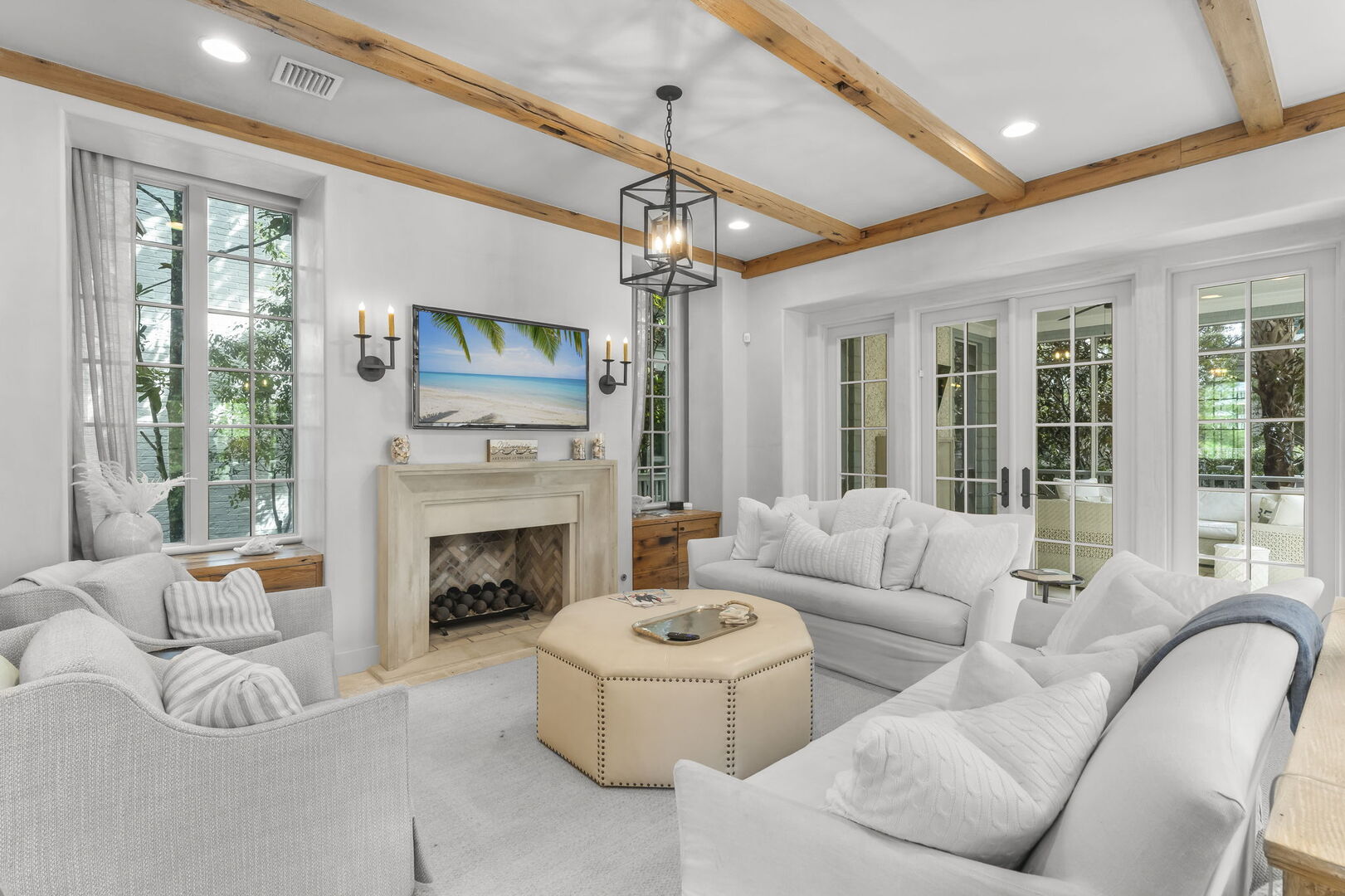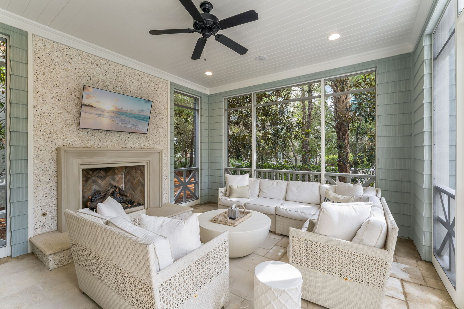 Modern coastal living room with direct access to a screened patio.