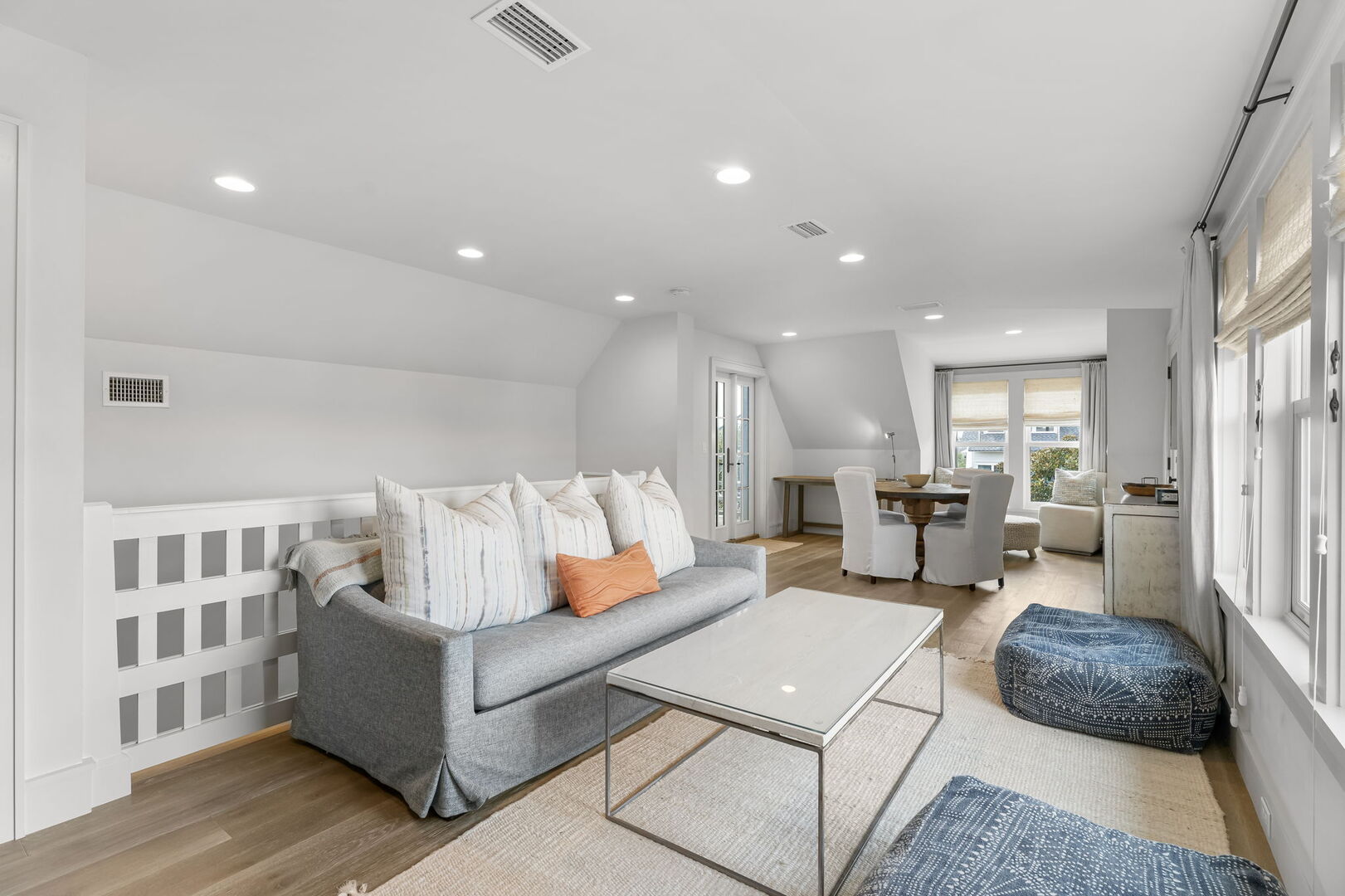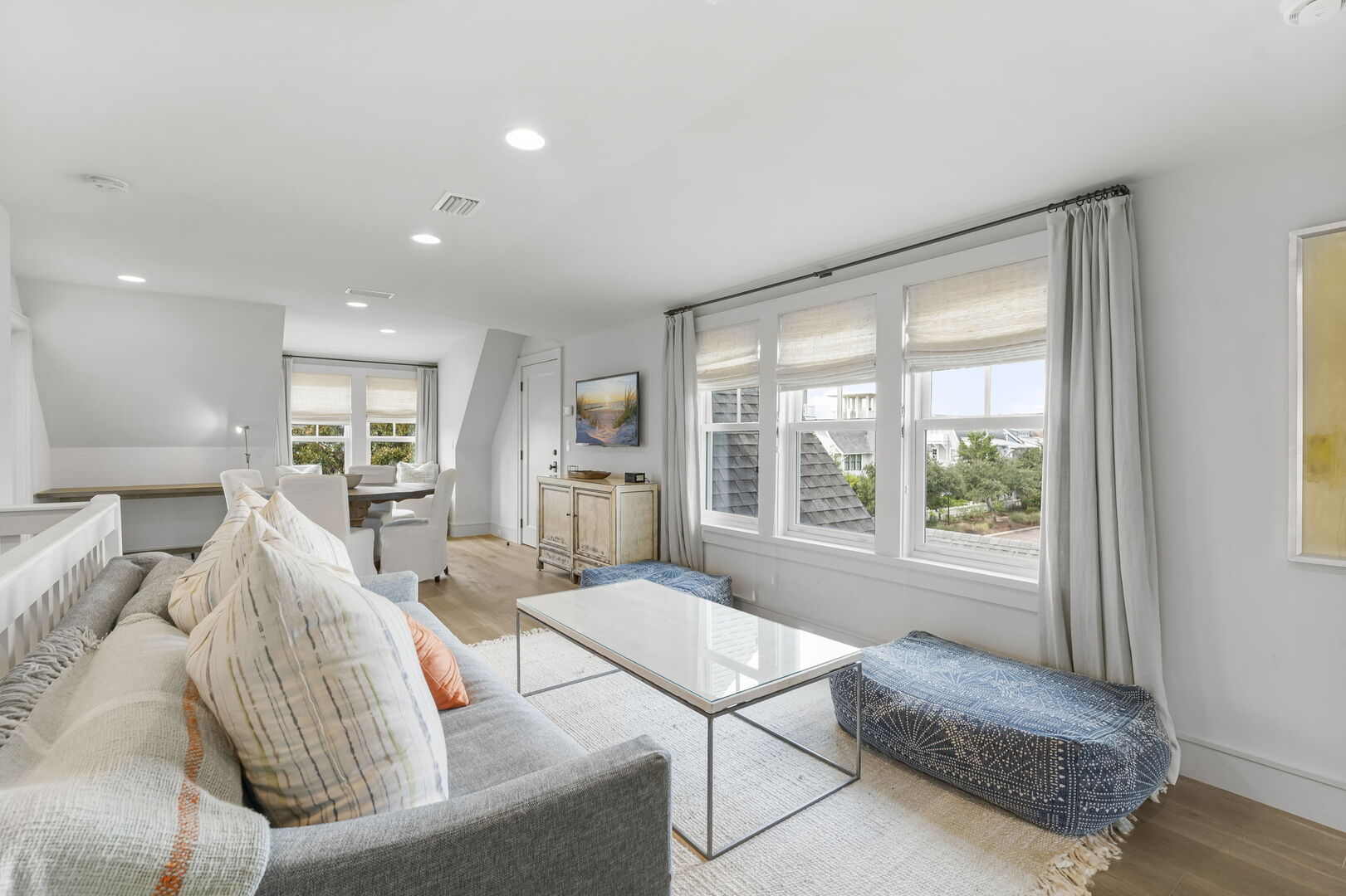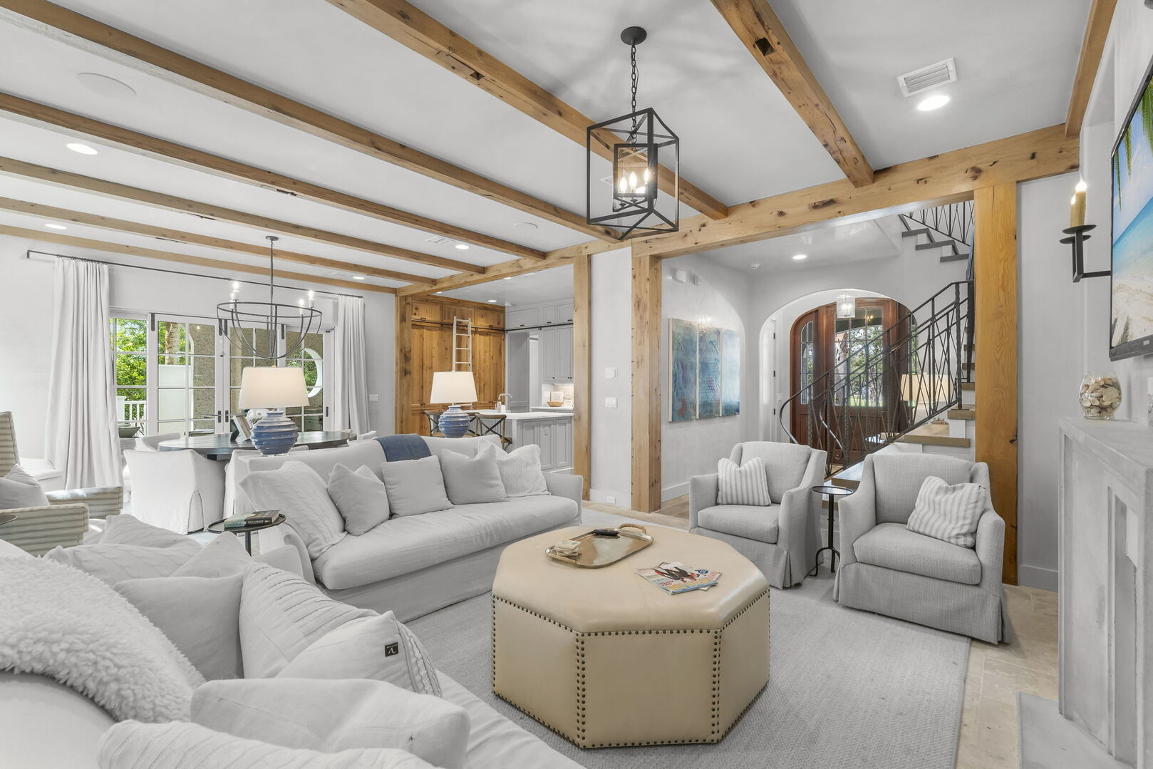 Modern coastal living room with direct access to a screened patio.