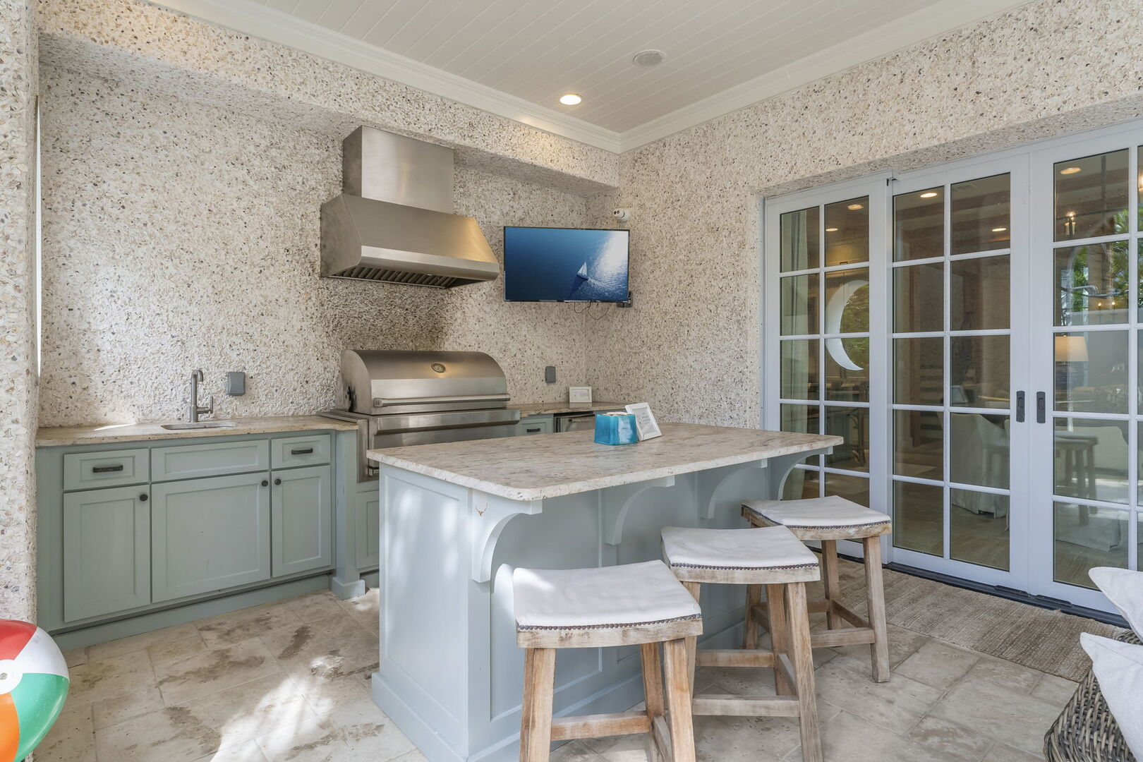 Screened-in patio off living room with built-in gas grill and large island.
