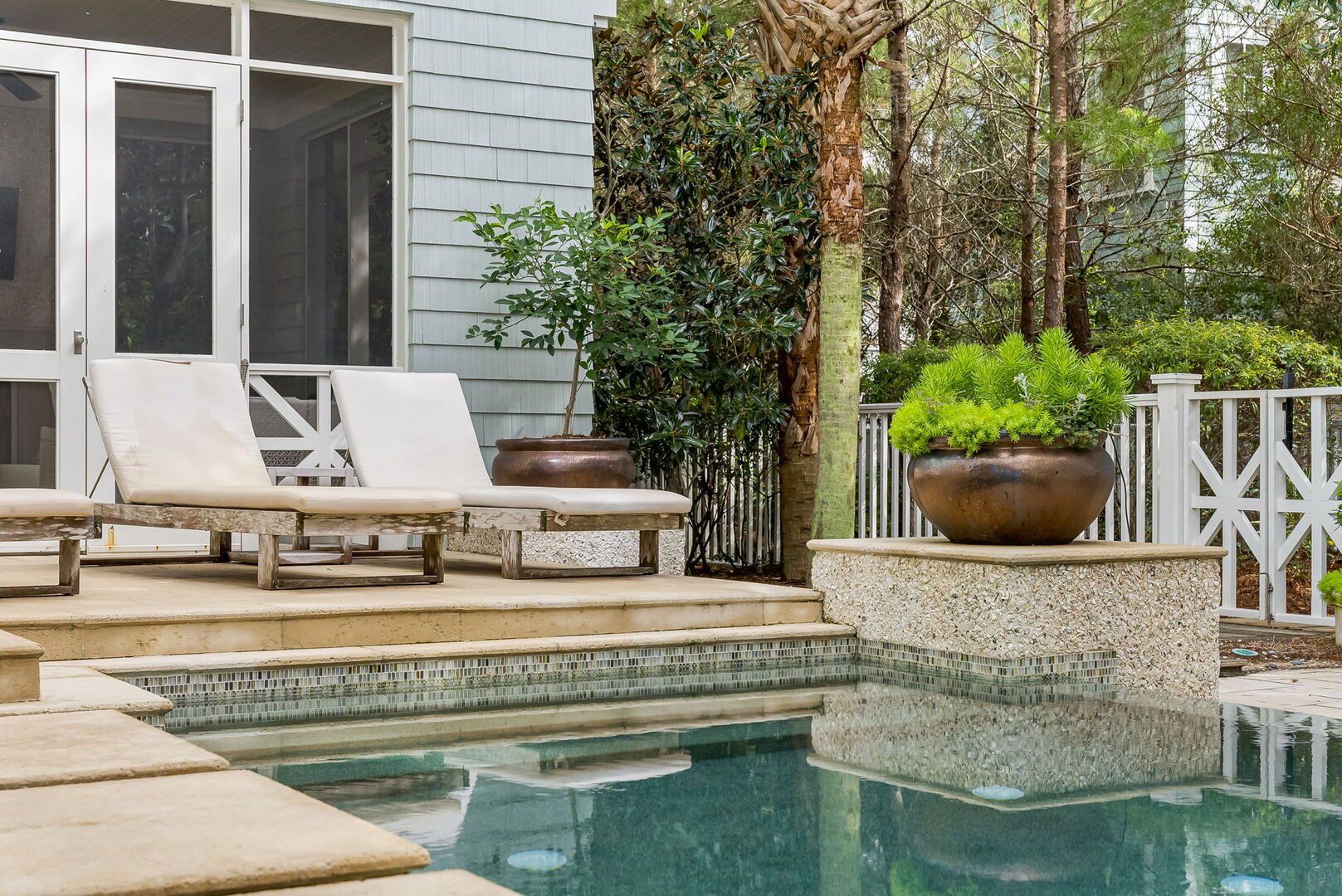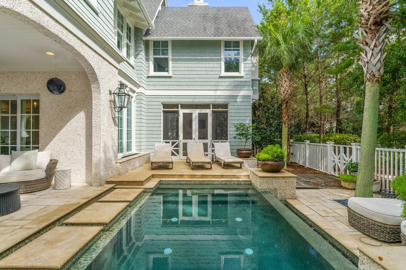 Private pool with outdoor seating & lounge chairs.