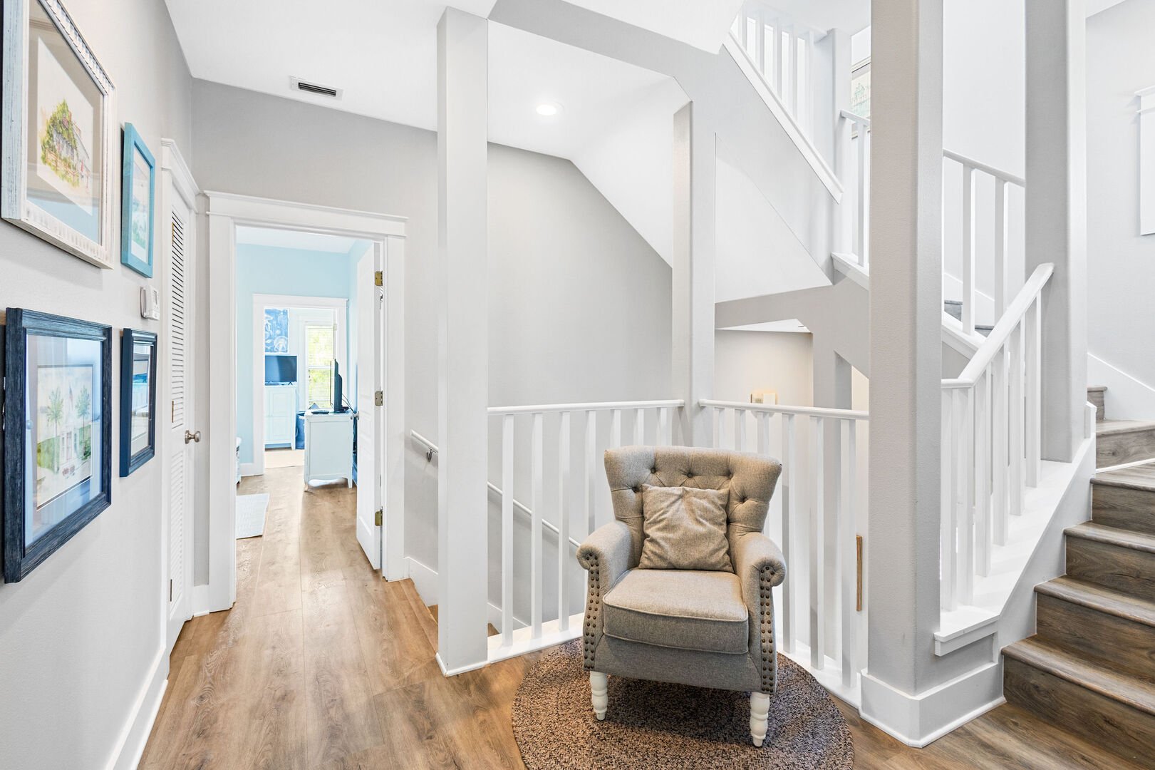 Stairs lead to the second floor featuring two additional bedrooms.