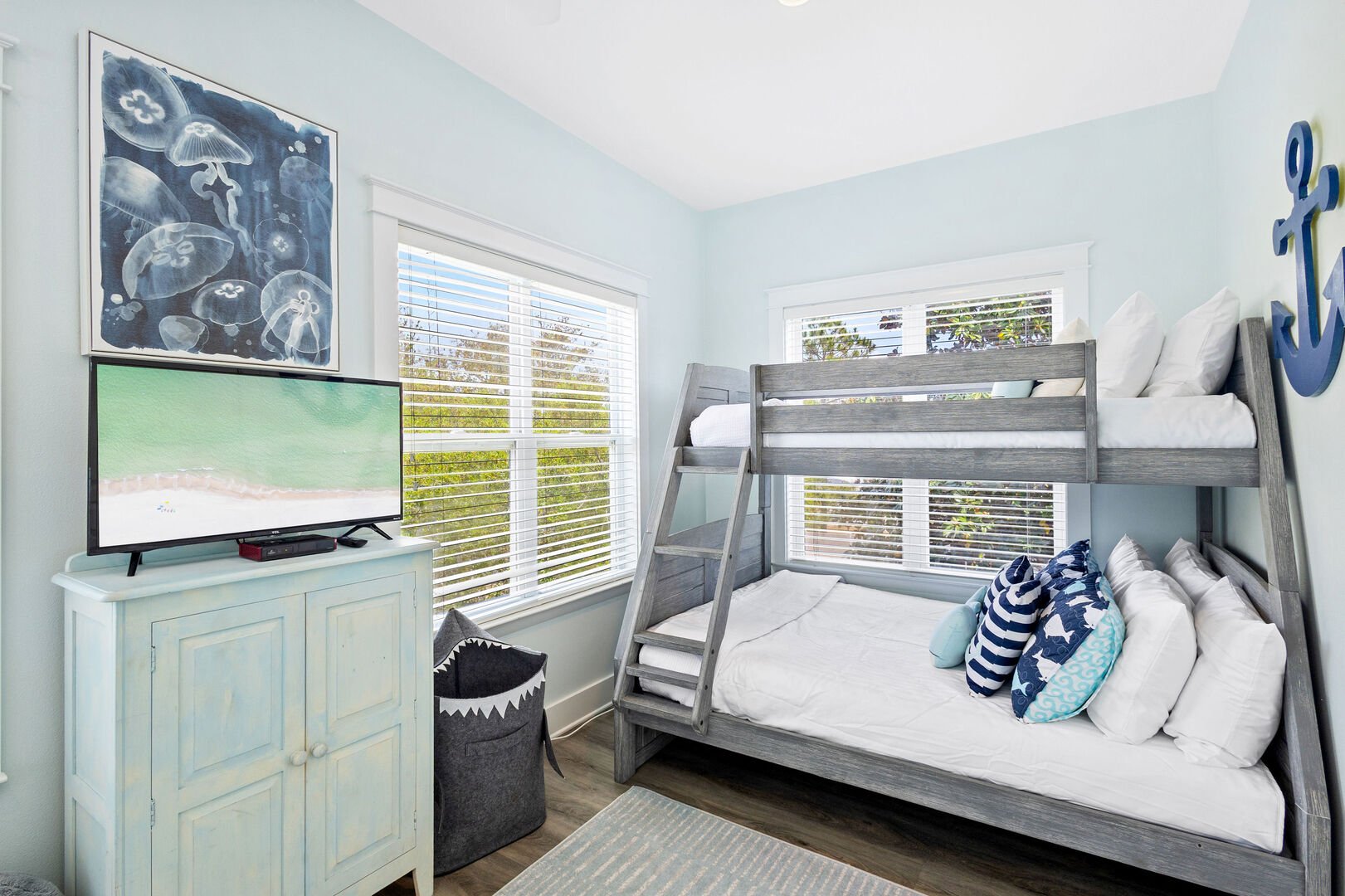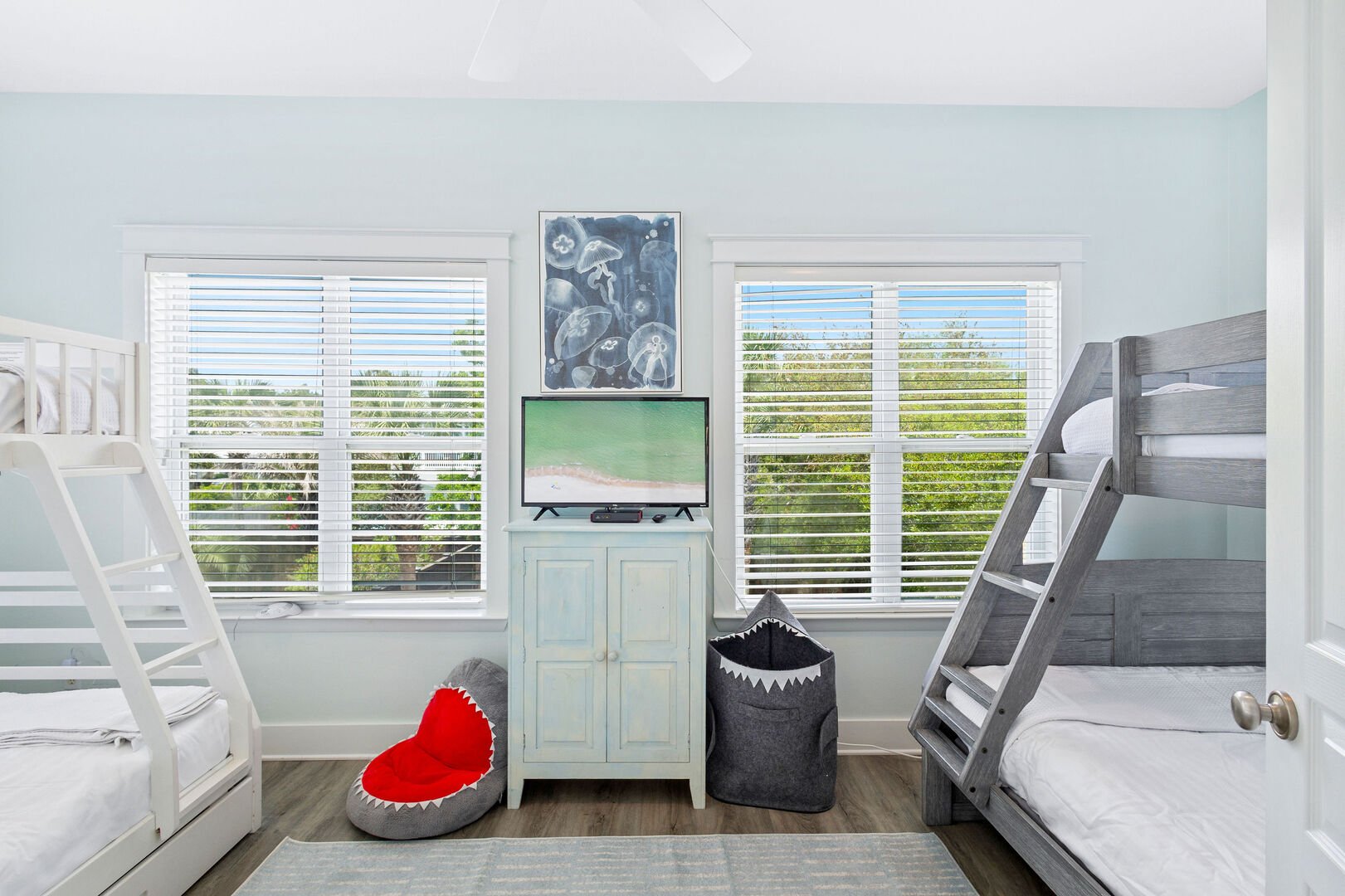 Bedroom #3 features (2) twin over full bunks and a smart tv.