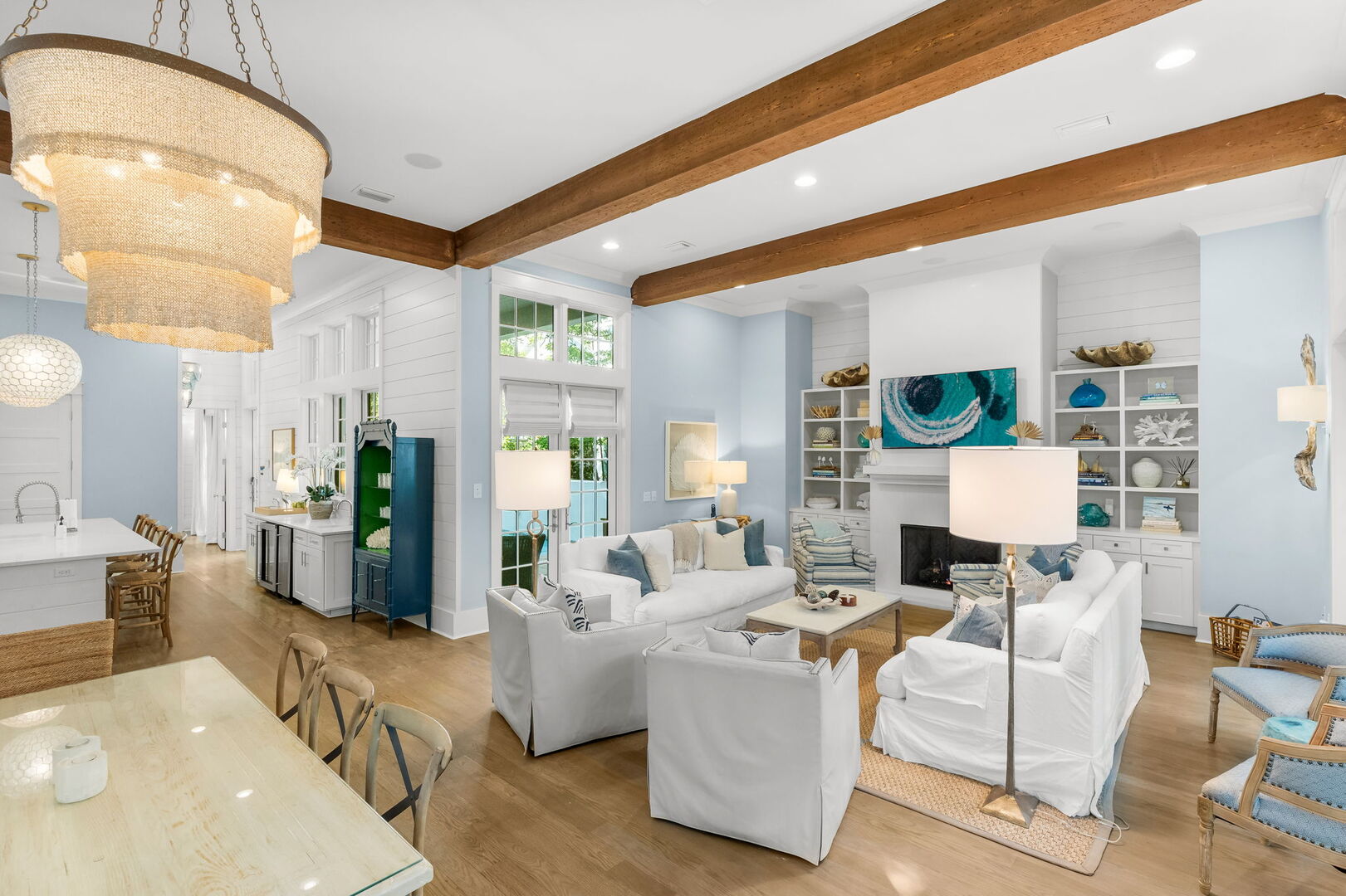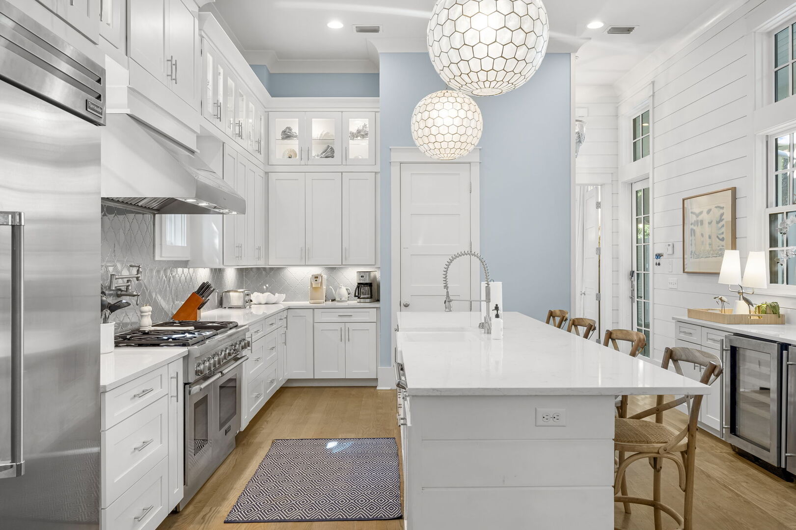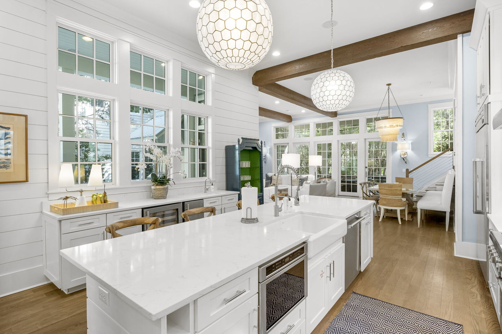 Step inside to find professionally curated interiors that blend elegance and comfort, with a bright, open-concept layout that flows seamlessly between the cozy living room, spacious dining area, and gourmet kitchen. Outfitted with high-end appliances, granite countertops, custom cabinetry, and a large breakfast bar, the kitchen is ideal for gathering after a day at the beach.