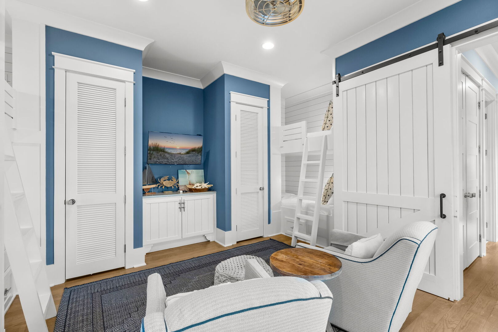 Bedroom #4 features (2) Twin-over-Twin bunks, with access to porch and smart tv.