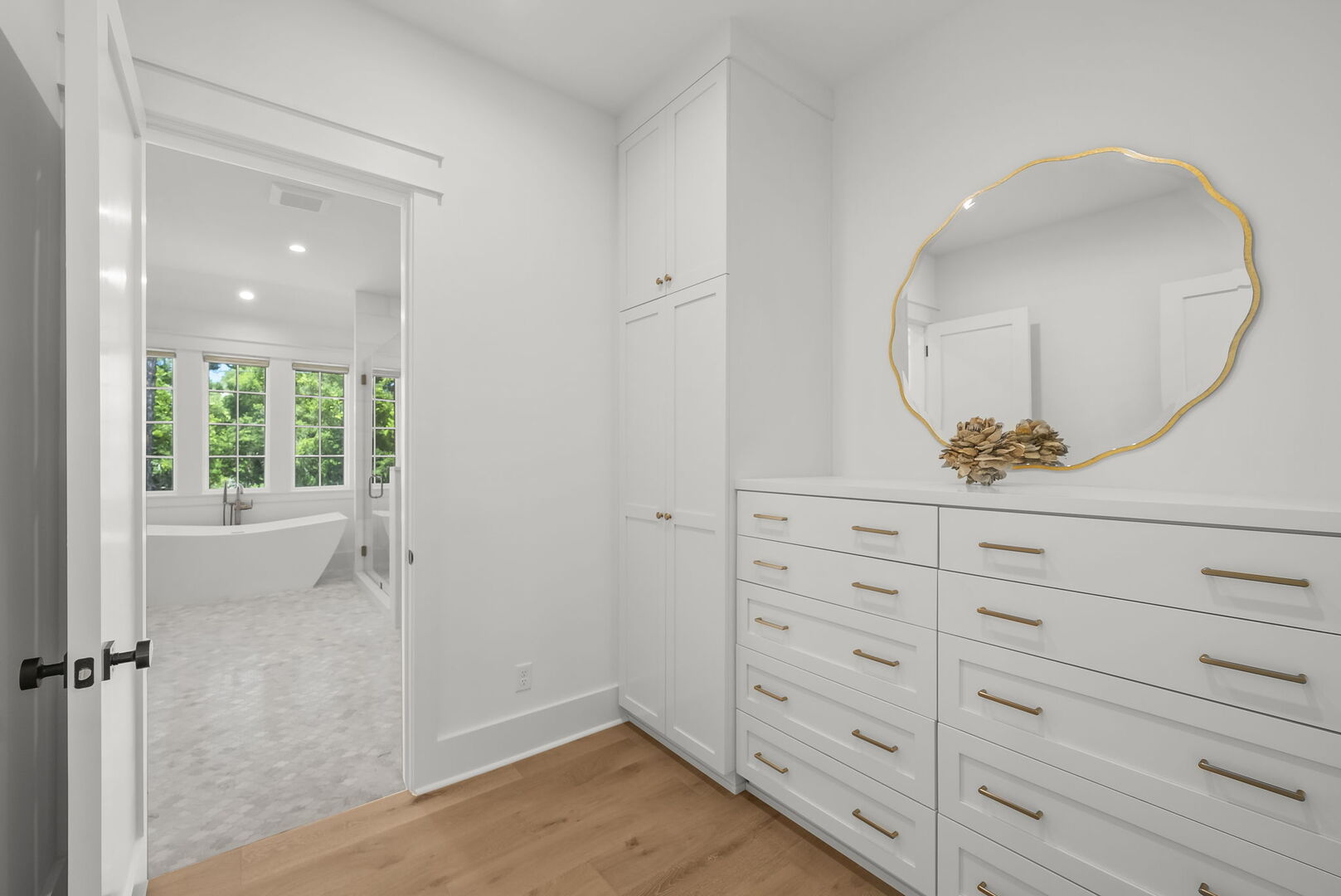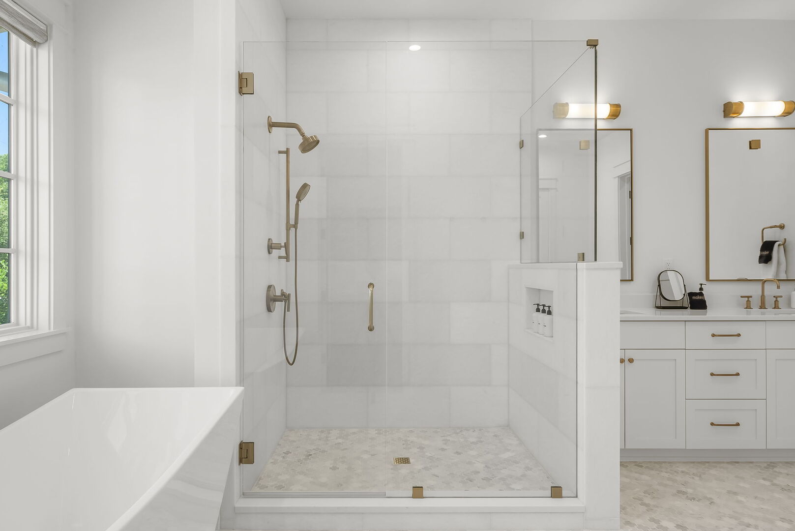 Bathroom features dual vanities, a walk-in shower and soaker tub.