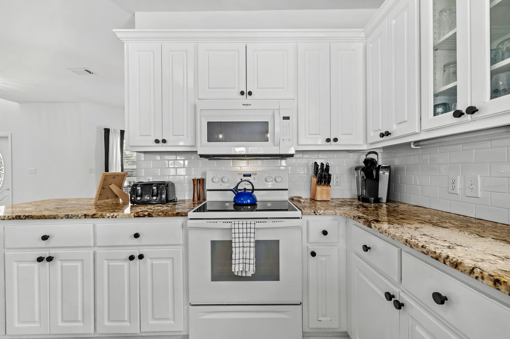 Large kitchen is fully stocked with all your cooking essentials! Perfect for cooking together.