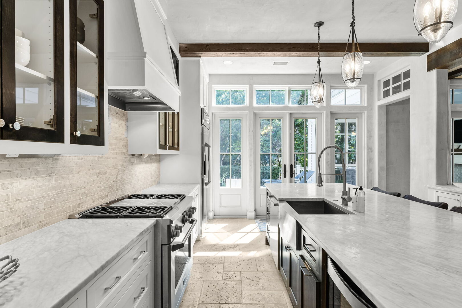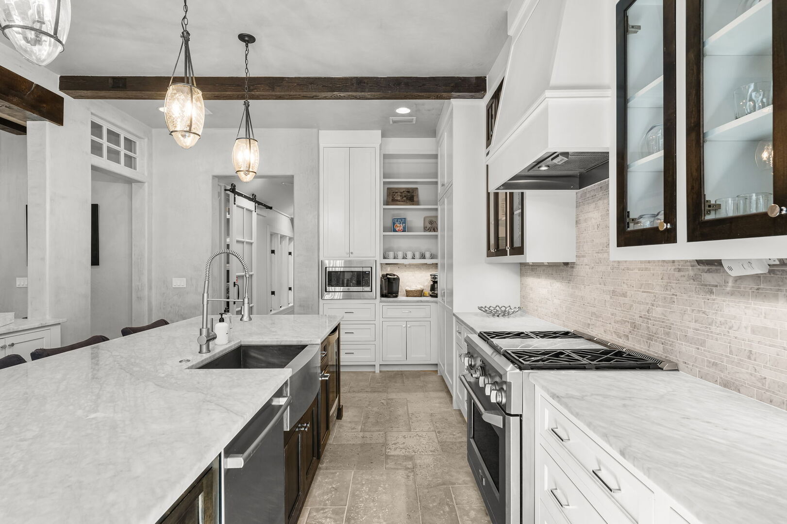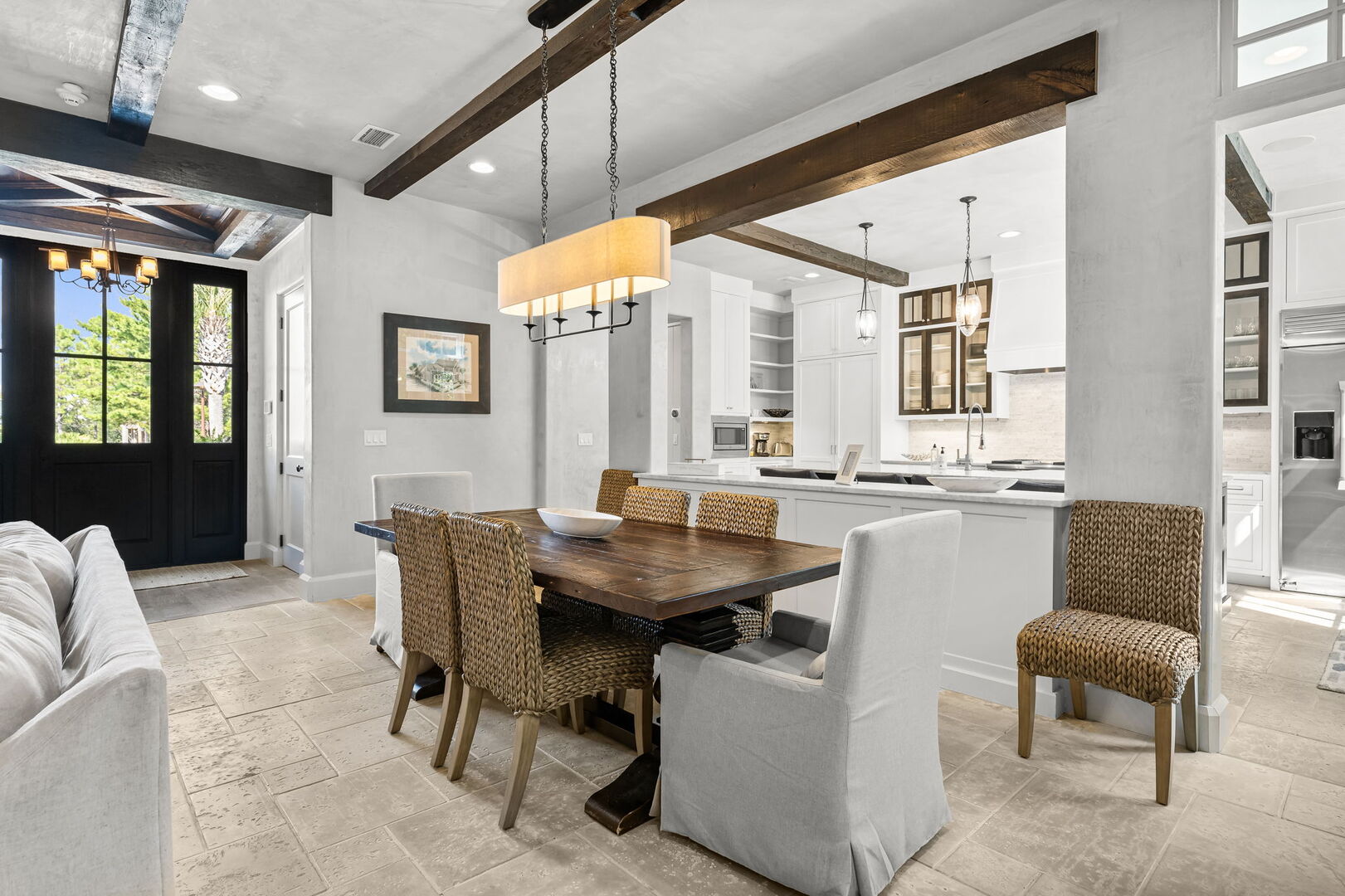 Inside, the home’s thoughtful design shines through in every detail, from the Venetian plaster walls to the 100-year-old repurposed wooden beams that add both texture and character. The open-concept living and dining spaces offer the perfect backdrop for gathering with family and friends, while the well-equipped kitchen makes preparing meals and entertaining a pleasure.
