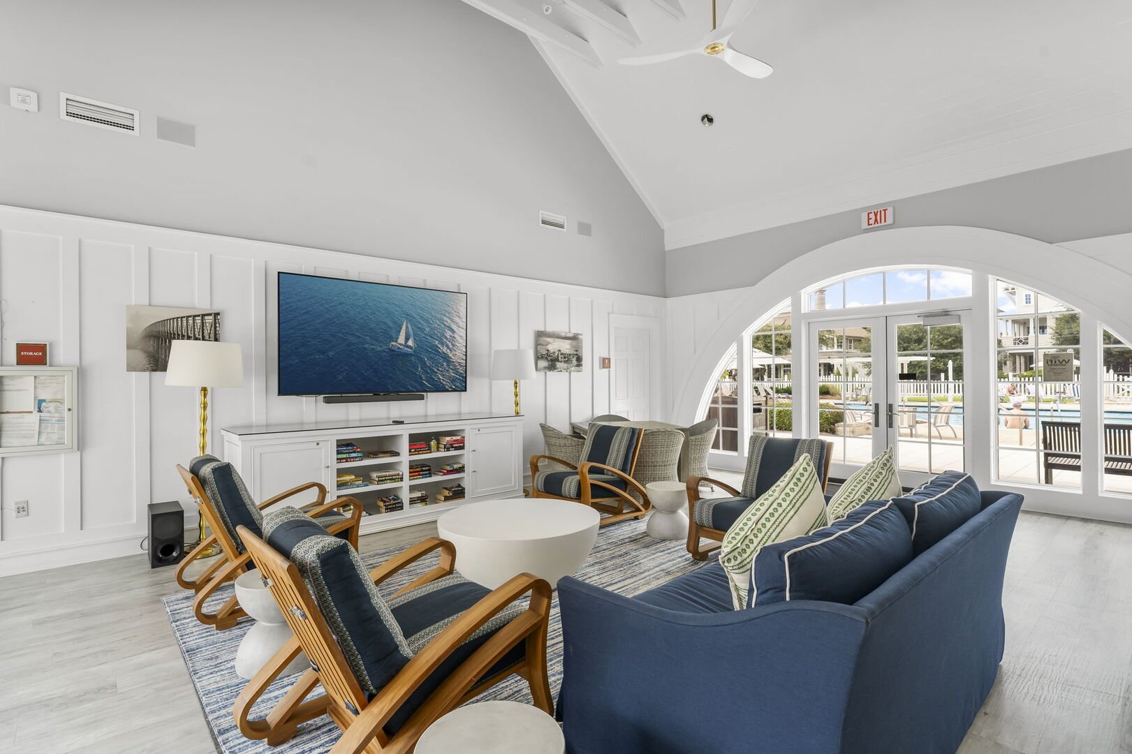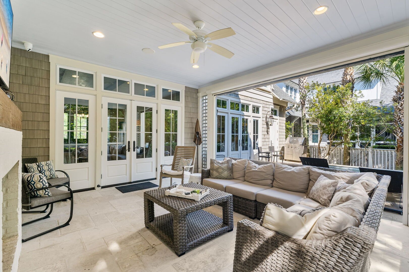 Modern coastal living room with direct access to a screened patio.