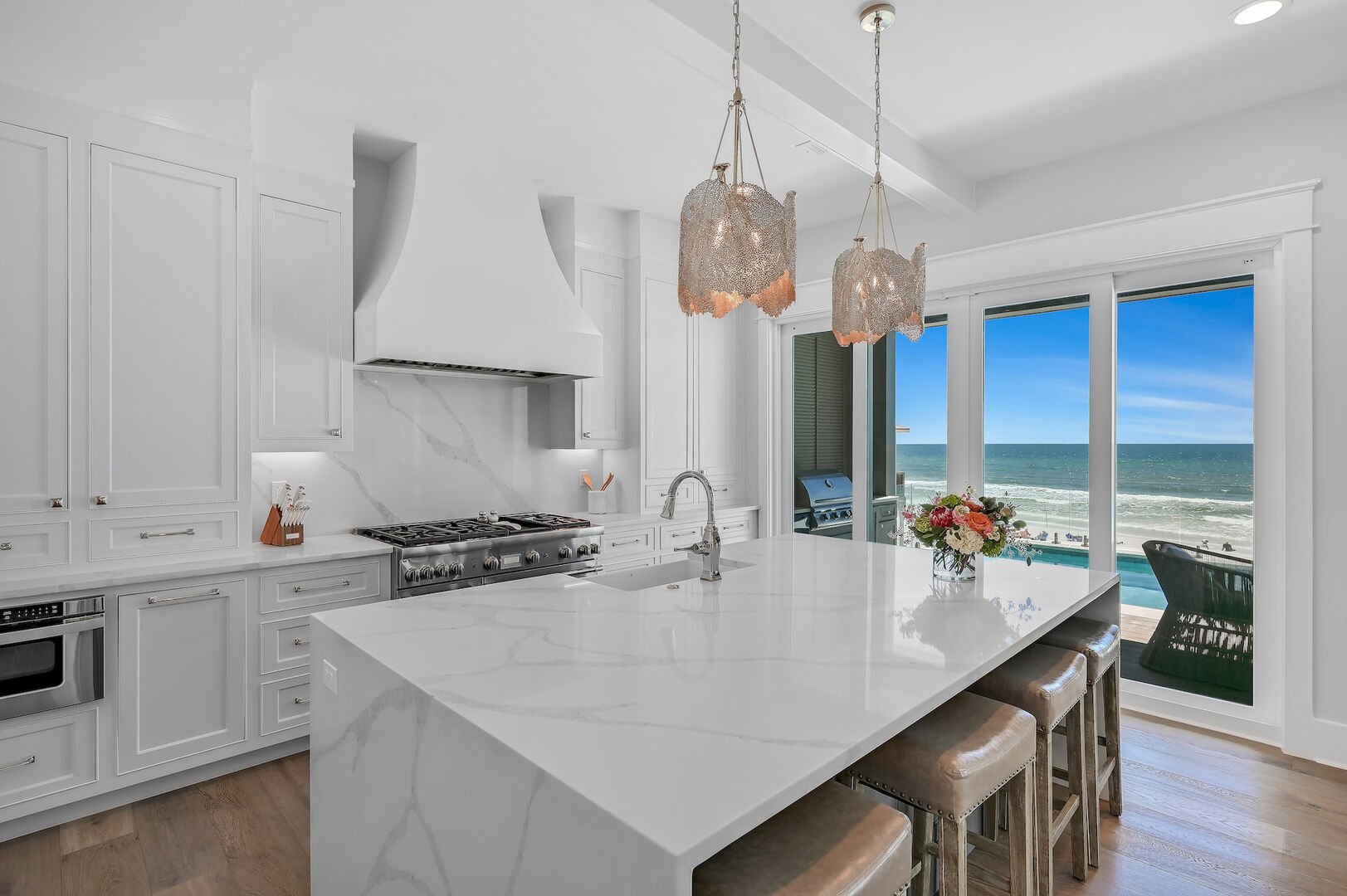 Upon entering this 4-story residence, guests will find a bright great room, aglow with sunshine from the stunning Gulf-front views. An inviting living area offers plush seating around a 75” TV, while a nearby sitting room provides additional comforts with a queen sleeper sofa—ideal for last-minute visitors. Guests can easily prepare cocktails with a wine fridge and ice maker at the wet bar before sitting at the 10-seat dining table for a home-cooked meal. The pristine white kitchen, featuring a stunning marble island with a built-in sink, is fully equipped with high-end Thermador appliances, making it easy to host large groups. Enjoy access to the spacious outdoor deck from anywhere in the great room—swim in the private pool with a built-in sitting spa, relax on 4 cozy loungers, or grill up some snacks in the outdoor kitchen.