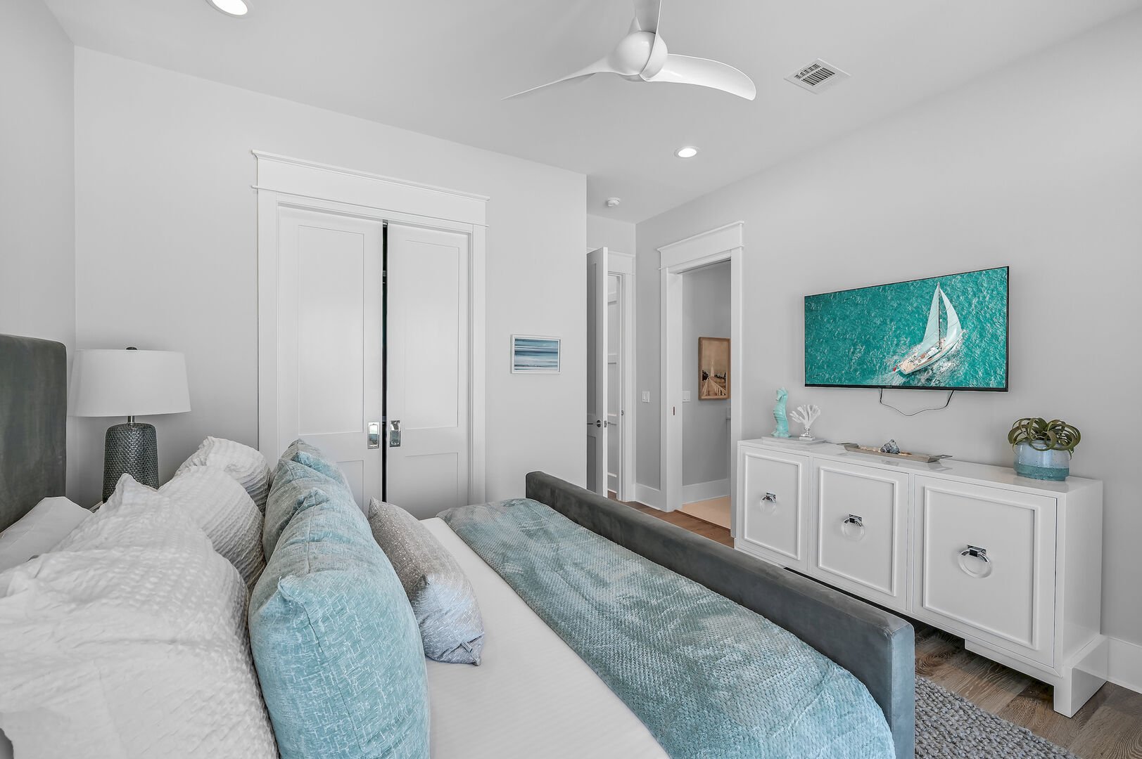 Second bedroom on fourth floor features a king bed, views of the gulf, and balcony.
