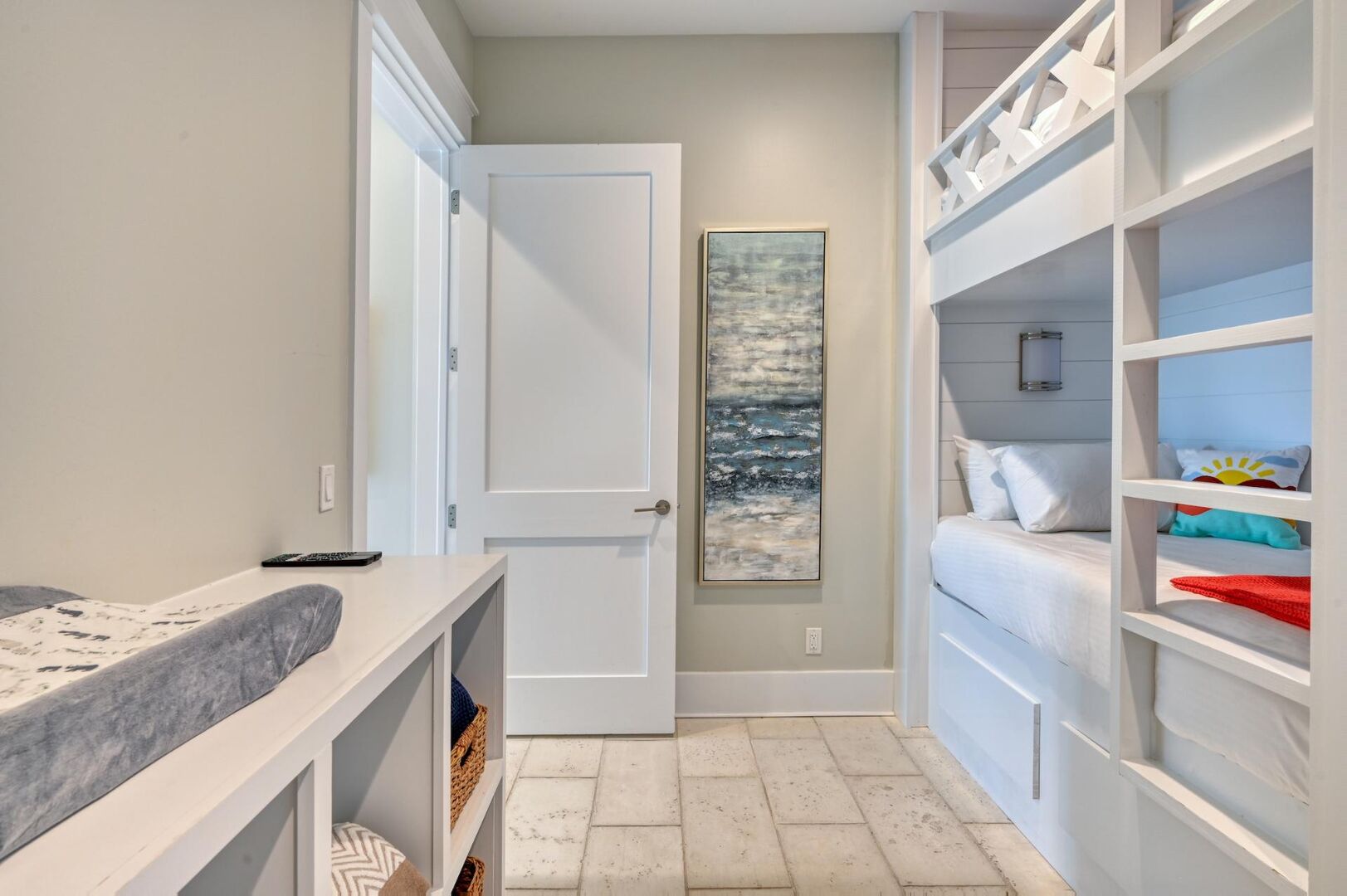 Ground level bedroom features twin bunks and a crib.