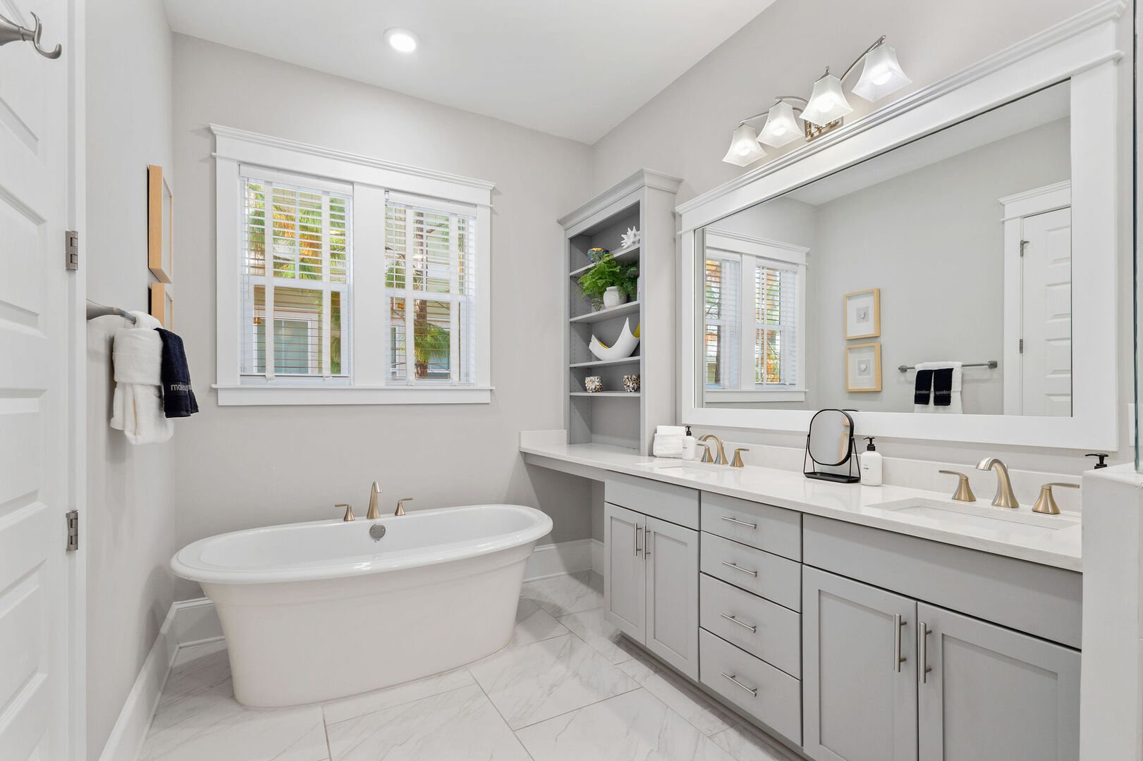 Bathroom features, dual vanities, walk-in shower and soaker tub.
