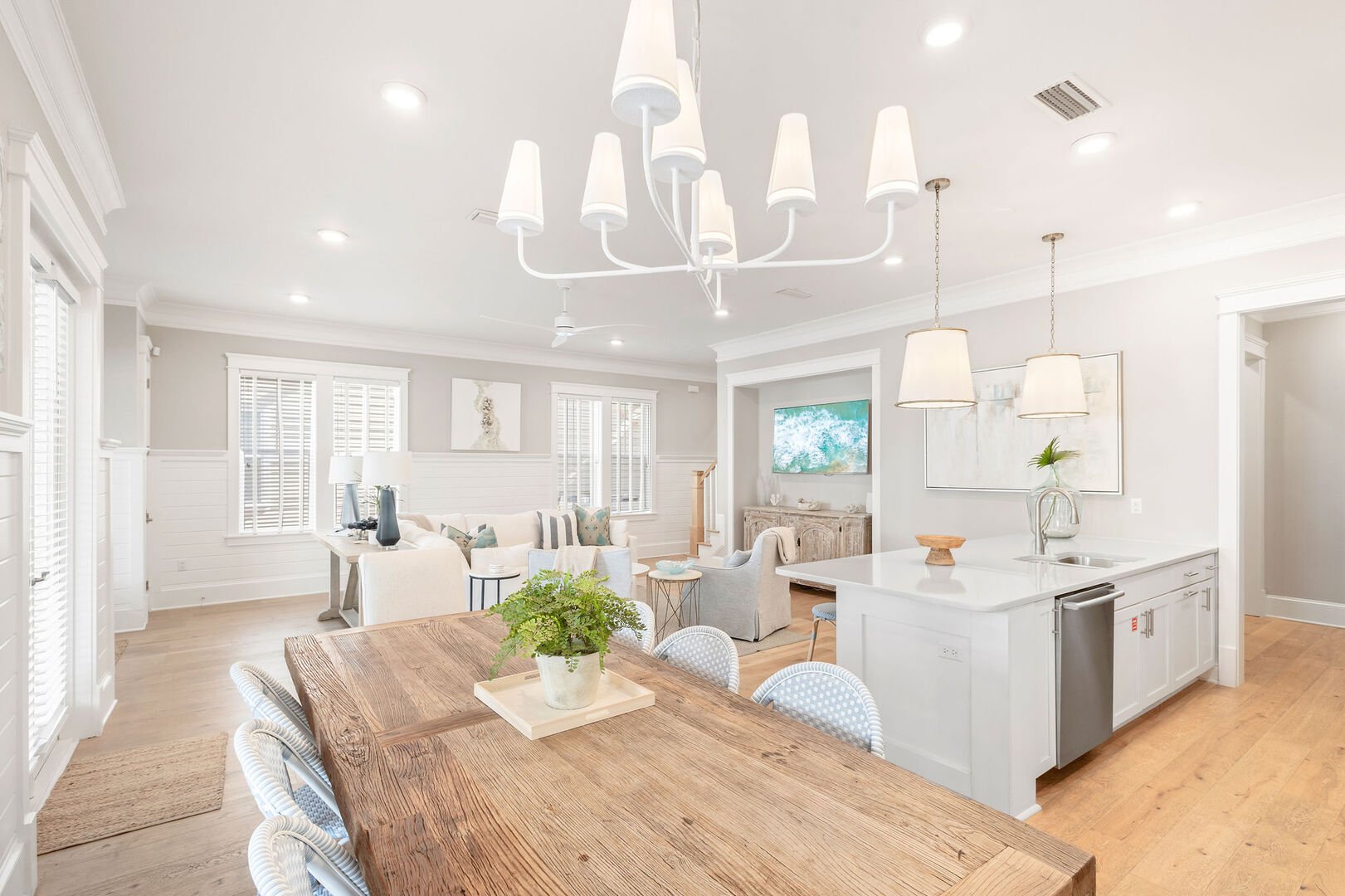 Dining room table feature seating for 8, with an additional 4 seats at the large kitchen island.